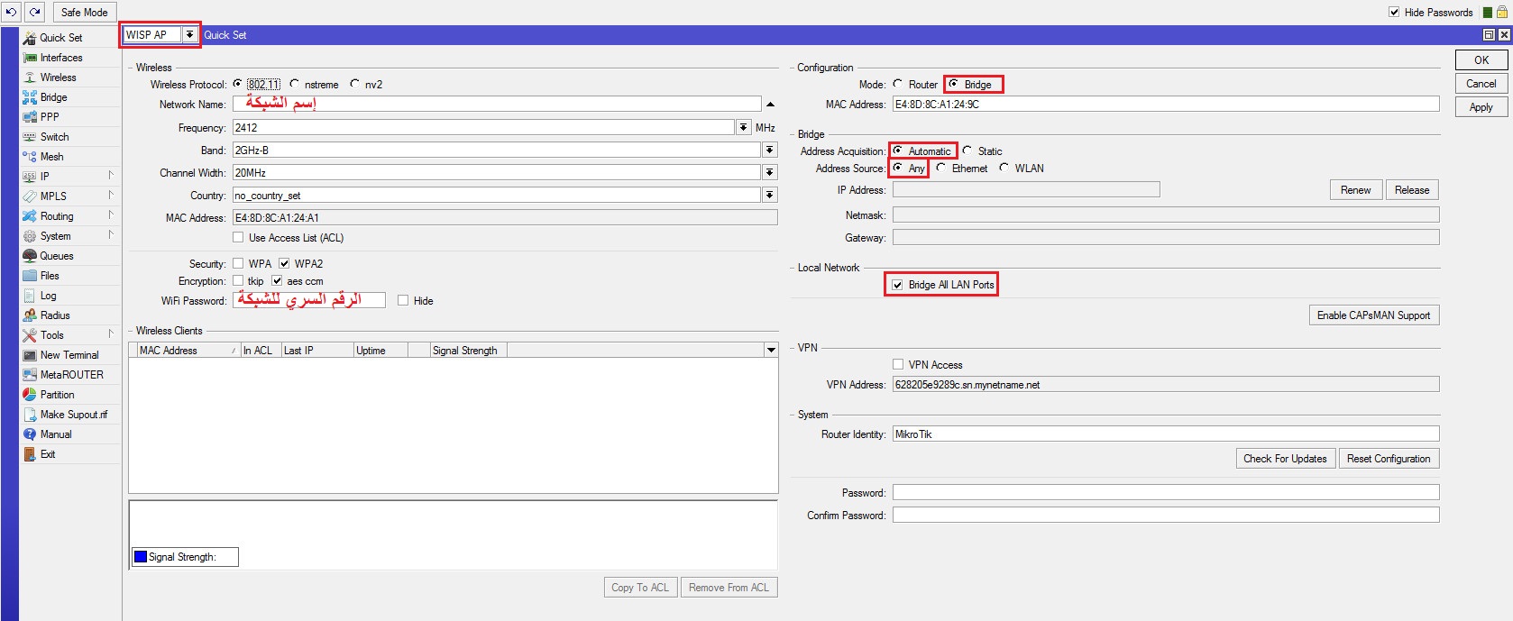الصورة التالية توضح بشكل مبسط برمجة جهاز المايكروتيك كأكسس بوينت